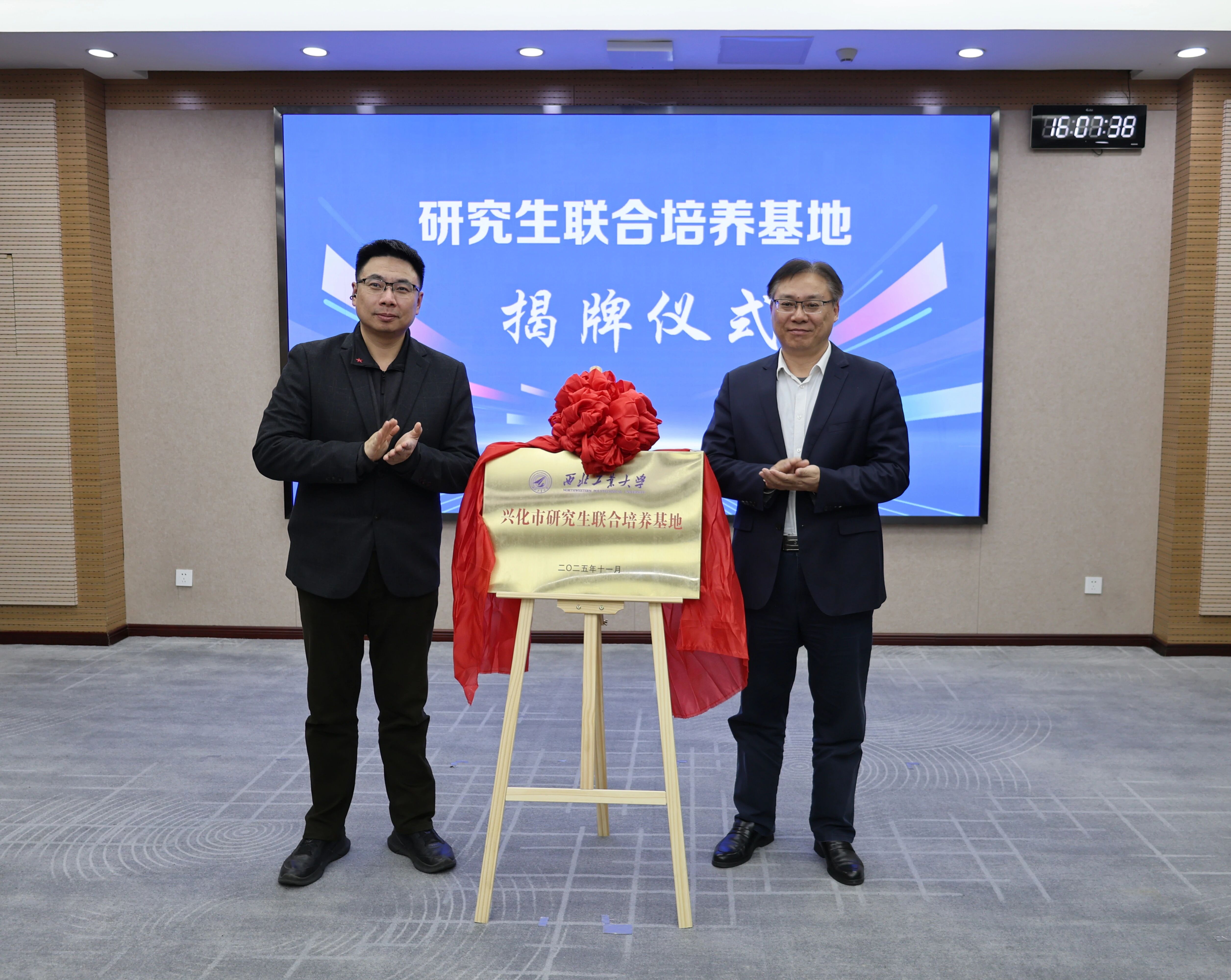 西北工业大学研究生院院长朱继宏和泰州市委组织部副部长黄新华为"西北工业大学-兴化市研究生联合培养基地"揭牌。