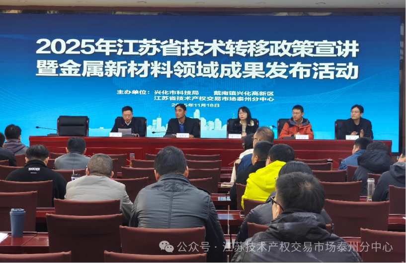 为服务本地企业、研发机构等创新主体高效开展技术转移与成果转化,推动科技创新与产业创新深度融合,11月18日,兴化区域首场科创集市活动——江苏省技术转移政策宣讲暨金属新材料领域成果发布会成功举办。